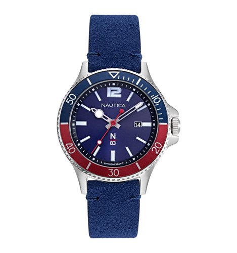 Orologio da uomo solo tempo della collezione N.83 Accra Beach. Cassa in acciaio del diametro di 43 Mm. Quadrante blu con datario, cinturino in pelle nabuk blu. Movimento al quarzo, resistente all'acqua 5 atmosfere.