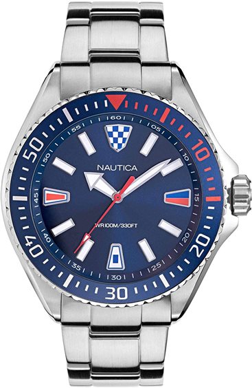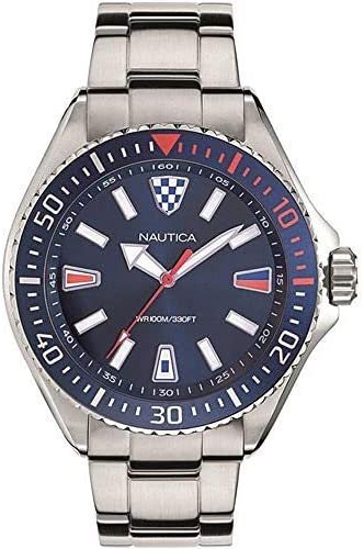 Orologio solo tempo da uomo di Nautica della collezione Crandon Park Beach. Modello con cassa del diametro di 46 mm in acciaio e indici e sfere luminose, fondello e corona a vite. Orologio con bracciale in acciaio, movimento a tre sfere. La resistenza all'acqua è di 100 metri.