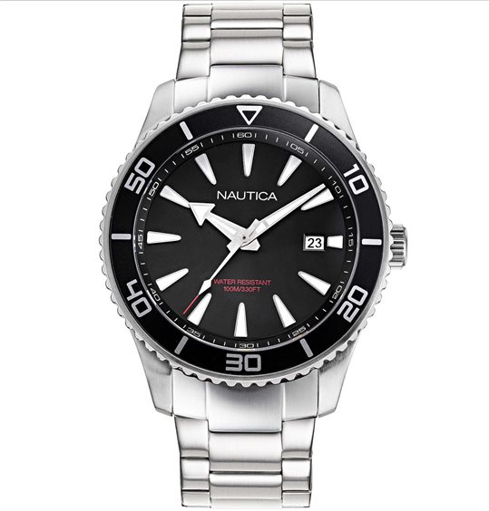 Orologio solo tempo da uomo di Nautica della collezione pacific beach. Orologio con cassa del diametro di 44mm in acciaio e indici e sfere luminosi e fondello e corona a vite. Bracciale in acciaio. La resistenza all'acqua è di 10 atm