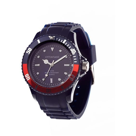 Orologio Solo Tempo Da Uomo Di Ottaviani. Modello Con Cassa In Policarbonato Blu Del Diametro Di 40Mm, Ghiera Girevole Unidirezionale Con Scala Sessagesimale Serigrafata Argento Su Fondo Blu/Rosso. Questo Orologio Ha Il Quadrante Blu, Indici A Punti Luminescenti E Barrette Luminescenti Al 3,6,9, Indice Triangolare Luminescente Al 12, Scala Dellaminuteria Serigrafata Bianca, Lancette A Bastone-. La Larghezza Del Cinturino È Di 2 Cm. Movimento Al Quarzo, Calibro Miyota 2035 E Funzioni: Ore, Minuti E Secondi. La Resistenza All'Acqua È Di 5 Atm.