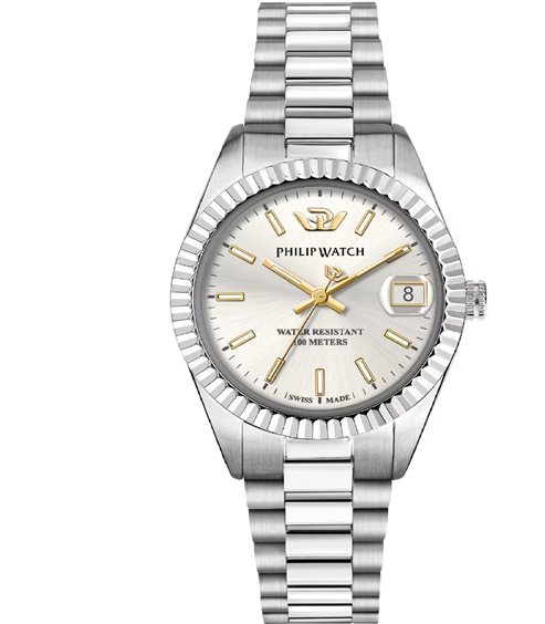 OROLOGIO DONNA IN ACCIAIO COLLEZIONE CARIBE.CASSA 28MM,10ATM.MOVIMENTO AL QUARZO,VETRO ZAFFIRO E FONDELLO A VITE.QUADRANTE SUNRAY CHAMPAGNE CON FINITURE IN OERO GIALLO.