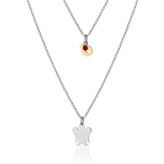 Collana da donna Roberto Giannotti in argento con ciondoli a forma di angelo e coccinella, della collezione AngeliGioiello realizzato in Argento 925 ipoallergenico .Ciondolo a forma angelo delle dimensioni di 1.4 cm x 1.2 cm. Sulla catena corta è presente un ciondolo a forma di coccinella in argento dorato e un charm in corallo rosso. Collana a doppia catena della lunghezza di 40 cm con 2 cm di riduzione, chiusura a moschettone.
