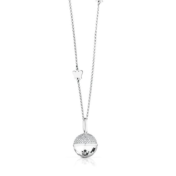 collana con chiama angeli ed elementi in argento. lunghezza catena 70 cm - angelo: base 0,7 cm - altezza 0,7 cm - diametro sfera 1,5 cm