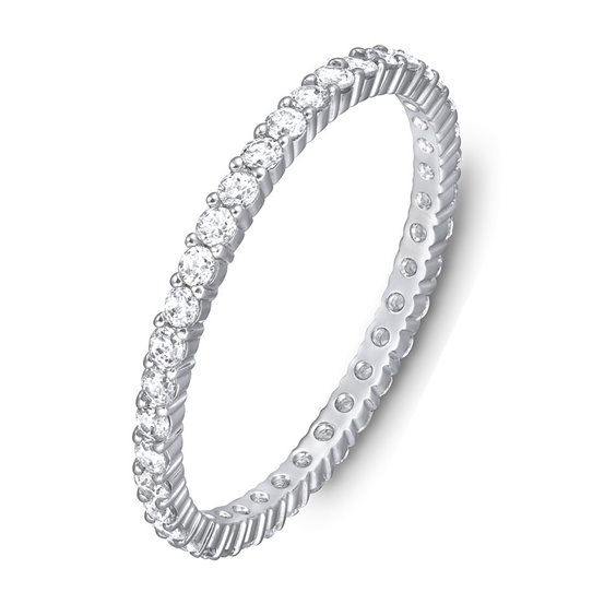 Un anello dalla luminosità a tutto tondo! Impreziosito dagli chaton che ne illuminano l'intera circonferenza, l'anello rodiato interpreta la tendenza per i gioielli discreti. Indossatene due o tre insieme per amplificarne la brillantezza.