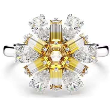 Anello di Swarovski della collezione IdylliaPlaccatura rodio con cristialli di colore Giallo. Anello cocktail Idyllia, Taglio misto, Fiore, Giallo, Placcato rodio. Misura regolabile, veste dalla tg 50 alla taglia 55 La referenza è: 5689087.