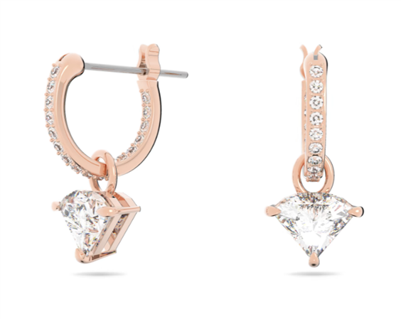 Questi orecchini pendenti geometrici esprimono uno stile di ispirazione punk. Le pietre dal taglio triangle, incastonate a mano per toccare gli apici di raffinatezza e brillantezza, sono sospese a cerchi impreziositi da pavé e placcati in tonalità oro rosa. Sovrapponili ad altri elementi geometrici della linea Ortyx per un look allegro ma con carattere.