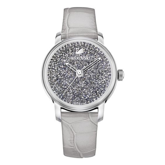Questo abbagliante orologio si impone come audace protagonista di fascino. Il design presenta un quadrante arricchito con circa 2.000 cristalli dai toni oro metallizzati per il massimo scintillio. Cassa in acciaio inossidabile e cinturino grigio in vera pelle con goffratura cocco completano il look. Un modo semplice per rendere più formale un outfit casual o per completare un lussuoso look da sera. Specifiche: Cassa 38 mm; impermeabile fino a 50 m; Swiss Made.
