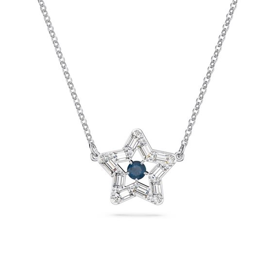 Abbandonati alla magia di una notte stellata con questo pendente Stella. La stella centrale luccica di cristalli taglio Baguette che circondano unapietra blu al centro. Questo design placcato rodio è dotato di una chiusura a sfera scorrevole per adattarsi a misura. Lunghezza minima: 38 cm Lunghezza massima: 41 cm Larghezza: 3.6 cm Materiale: Cristalli, Placcatura rodio, Zirconio Tipo di fermaglio: Anello a molla.