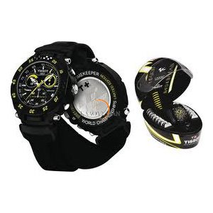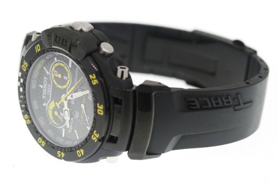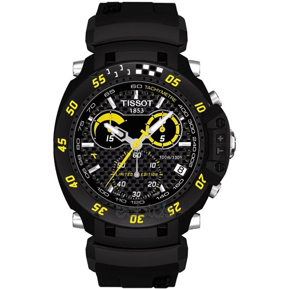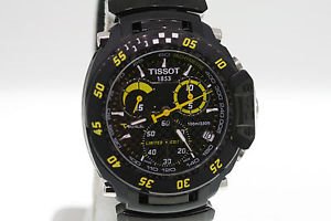 Orologio Tissot serie T Race EDIZIONE LIMITATA, cronometrista ufficiale campionato del mondo di Moto GP, numerato ( n. 6003 su 9002 ). In dotazione un astuccio particolare a forma di casco da motociclismo, con diciotto fondelli intercambiabili per la cassa dell'orologio con incisi i circuiti mondiali di moto GP. L'orologio è in acciaio trattato PVD, movimento al quarzo ETA swiss made, cronografo, impermeabile a 100 mt. datario al 4, quadrante in carbonio con contatori neri e gialli, e lancette cronografiche gialle. Cinturino in caucciù nero con chiusura deployante.