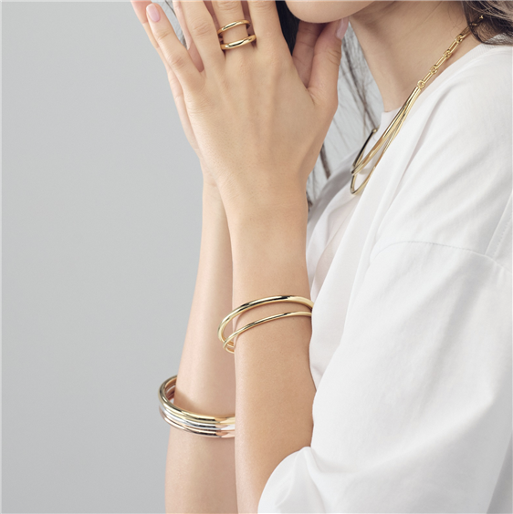 Bracciale bangle rigido in finitura lucida, misura 20,00 cm. Leggero ed elgante questo bracciale è perfetto per aggiungere un tocco di luce extra ad ogni tuo outfit. Un mix di contrasti tra eleganza classica ed innovazione contemporanea in perfetta armonia. Indossalo da solo o insieme ad altri bracciali per catturare ogni sguardo.