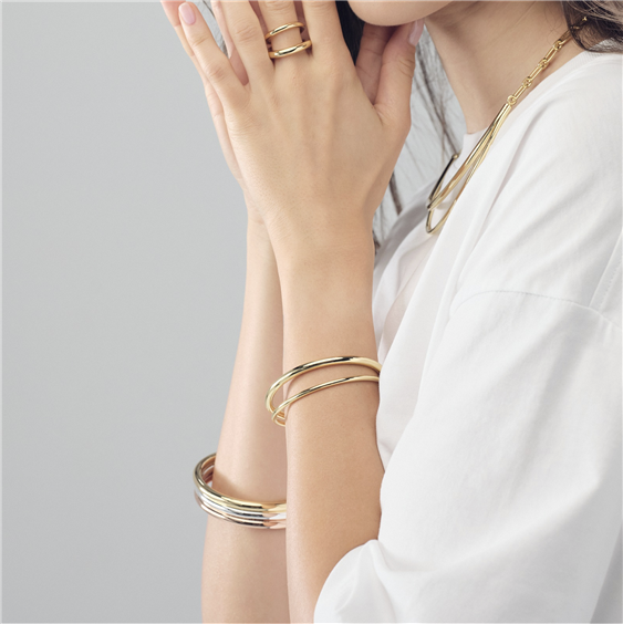 Bracciale bangle rigido in finitura lucida, misura 20,00 cm. Leggero ed elgante questo bracciale è perfetto per aggiungere un tocco di luce extra ad ogni tuo outfit. Un mix di contrasti tra eleganza classica ed innovazione contemporanea in perfetta armonia. Indossalo da solo o insieme ad altri bracciali per catturare ogni sguardo.