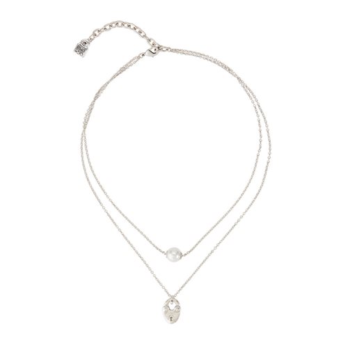 Moderna collana doppia, con catene a diverse altezze e entrambe bagnate nell argento, rifinite una con una classica perla bianca e l altra con un lucchetto a forma di cuore.